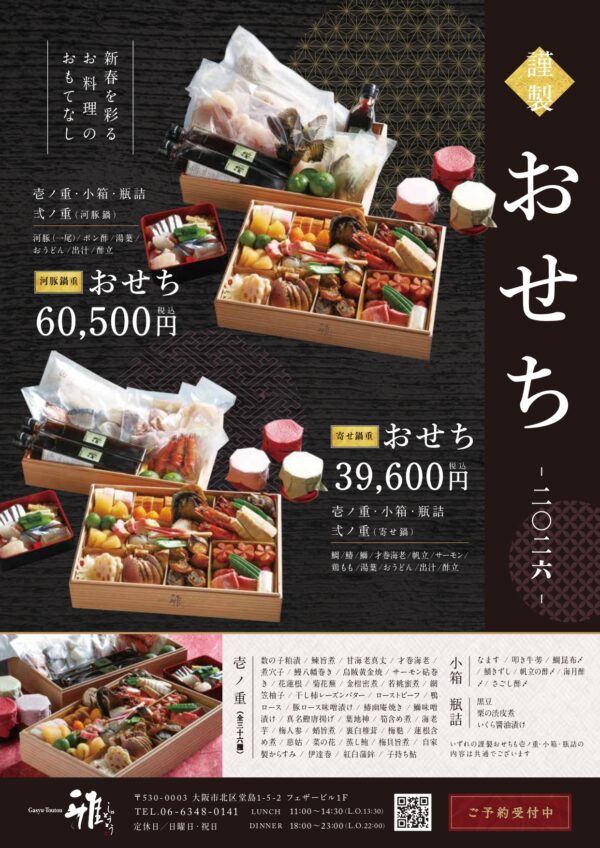 さて、雅しゅとうとうでは、年始を彩る「雅しゅとうとう 謹製おせち」のご予約を